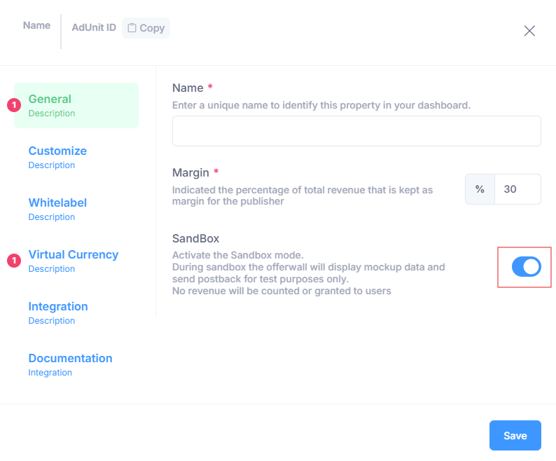 Test your Ad Unit before it goes live by selecting the Sandbox option in the bottom-right corner when creating the Ad Unit: