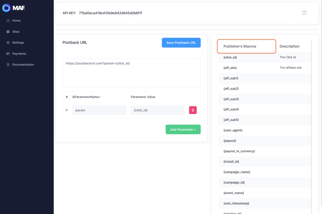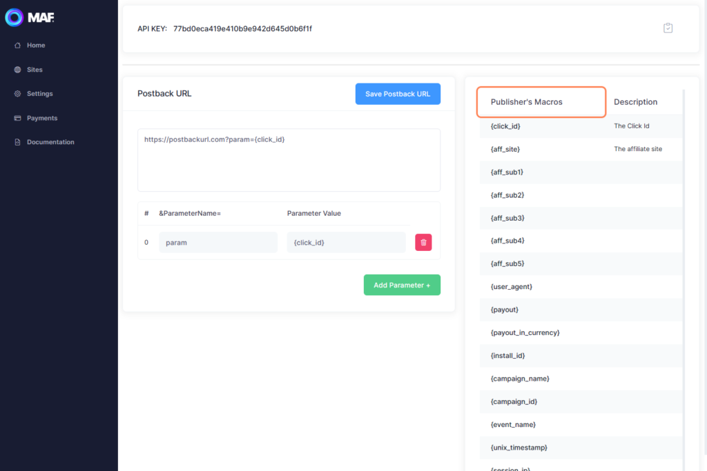 On the right, you’ll see a list of Macros that are available to use in your Postback URL.