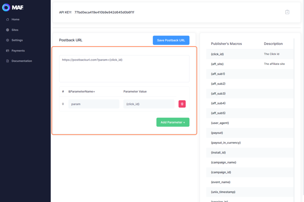 To set up a Postback URL in our Platform, go to Settings section and find the Postback URL section on the left.